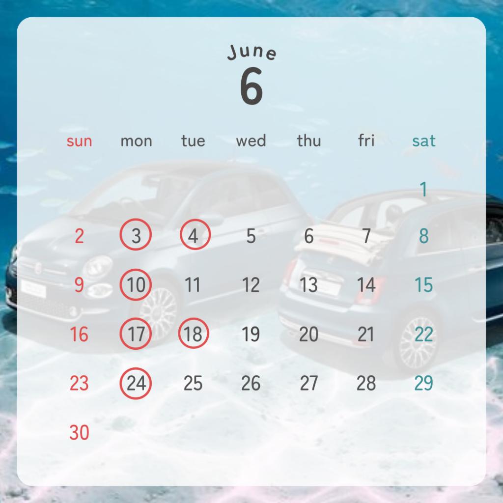 いつもフィアット/アバルトのブログをご覧いただきありがとうございます。6月の定休日・イベントのお知らせです!定休日はこれまでと変わらず毎週月曜日と第一、第三火曜...